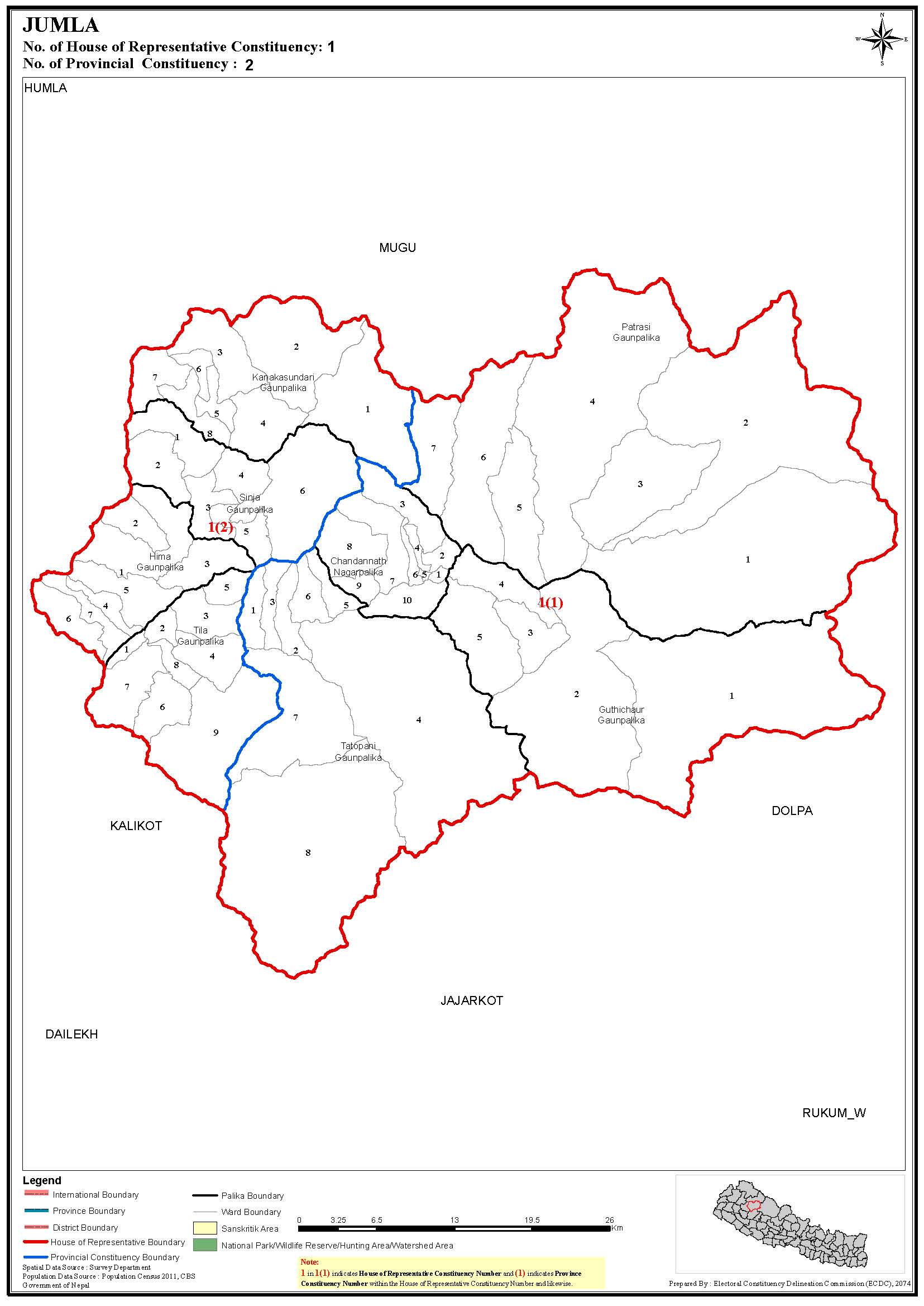 Jumla District had 1 Federal Constituencies and 2 Provincial Constituencies with total registered voters – 108,921 in 2017 Election. Jumla had total population 54,677 as per 2011 Census. (Source: Nepal Election Commission)