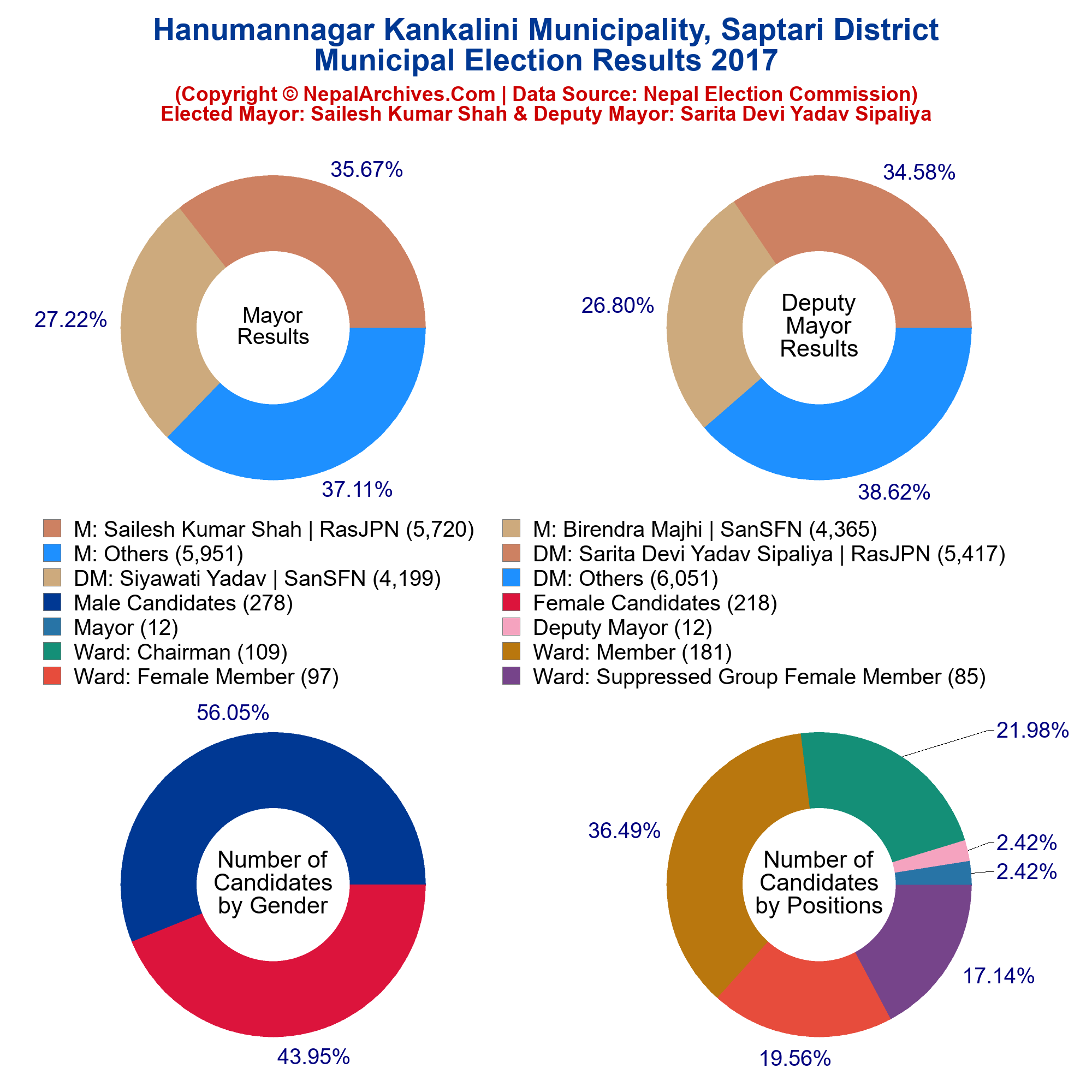 Municipal Election Results 2017 Piechart of Hanumannagar Kankalini Municipality, Saptari District is based data obtained from Nepal Election Commission.The chart contains brief information about name, affiliated political party and total votes obtained by the winner, first runner-up and all other candidates combined for key municipal positions as well as number of candidates based on gender and positions.