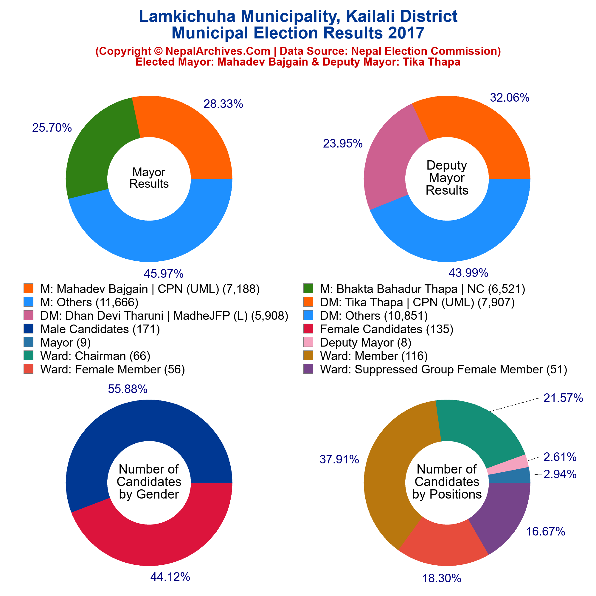 Municipal Election Results 2017 Piechart of Lamkichuha Municipality, Kailali District is based data obtained from Nepal Election Commission.The chart contains brief information about name, affiliated political party and total votes obtained by the winner, first runner-up and all other candidates combined for key municipal positions as well as number of candidates based on gender and positions.