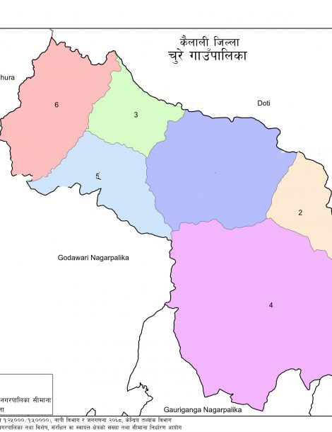 Chure is a Rural Municipality located in Kailali District of Nepal. It has total 6 wards and 493 square kilometers of geographical area. According to 2011 census, it had total population of 18,924.