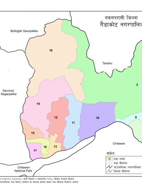 Gaidakot is a Municipality located in Nawalparasi_E District of Nepal. It has total 18 wards and 160 square kilometers of geographical area. According to 2011 census, it had total population of 58,836.